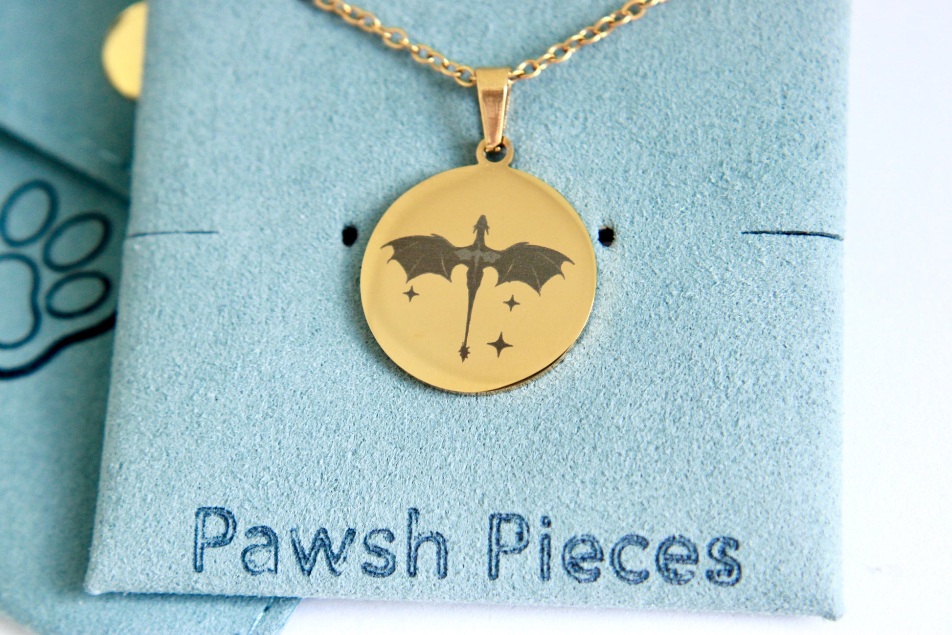 Crafted in stunning gold stainless steel, this piece features a sleek silhouette of a dragon mid-flight surrounded by stars — a subtle nod to the world of Basgiath and the bond between rider and dragon.